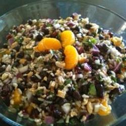 - Toss the red onion, cilantro, black beans, wild rice, dried cranberries, and cashews together in a large mixing bowl.